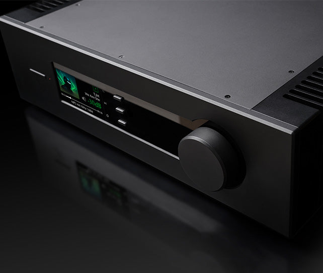 The 4.3-inch, 800 × 480 pixel IPS screen offers full menu navigation, multi-language support and real-time playback information. Choose between artwork-centred, data-rich or VU-meter displays—or dim the screen entirely for late-night sessions. A sculpted system handset mirrors the PLATINA design language and unifies command of every component in the range, while the front-panel encoder and included remote control provide precise, menu-driven control for swift parameter adjustment.