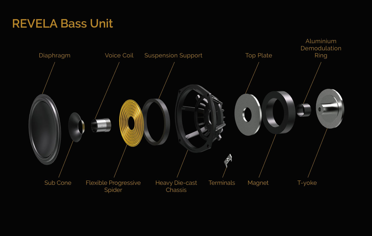 The Reveal diaphragm is incorporated into a driver built on a cast chassis and fitted with a high-power magnet and voice coils to achieve high sensitivity. The Revela 1 features a single 165mm mid/bass driver, whereas the Revela 2 dedicates two 165mm drivers to bass frequencies with a 150mm unit handling the midrange.