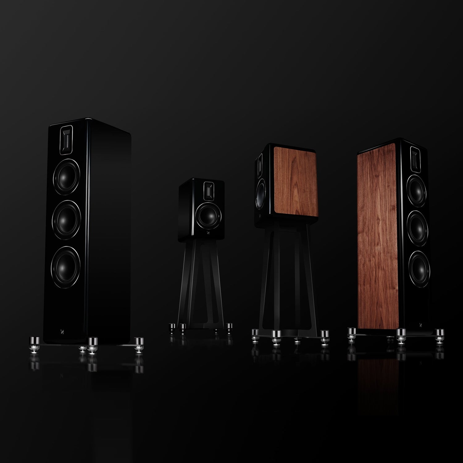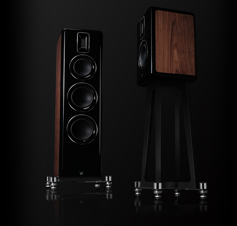 For the all-black finish option, multiple layers of lacquer are applied over deep black veneer to provide a lustrous finish, protect the cabinet and help damp unwanted acoustic radiation. The walnut finish option maintains the piano black front baffle, top and base, and adds interlocked wood veneer on the sides and rear, again generously lacquered.